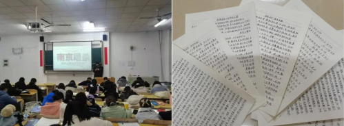 各班团支书用自己的方式带领同学们回顾这一惨痛的历史。各团支部成员纷纷发表自己的感悟。2021级专升本药学3、4班同学在讲台上与大家分享自己的感悟。