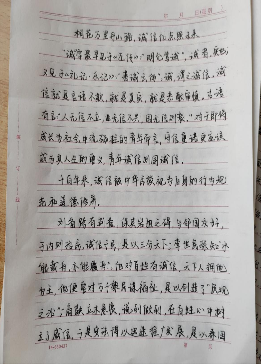 诚实守信历来都是中华民族崇尚的优良美德,也是中国人民向来尊崇的良好社会风尚。为树立大学生优良诚信品质,营造学校优良校风校纪,创建诚信校园,塑造优秀人品,特此,2021年12月13日,由共青团山东现代学院委员会主办,山东现代学院药学院承办的以“诚信筑未来,奋进新时代”为主题的诚信征文活动在德润楼各班级进行。