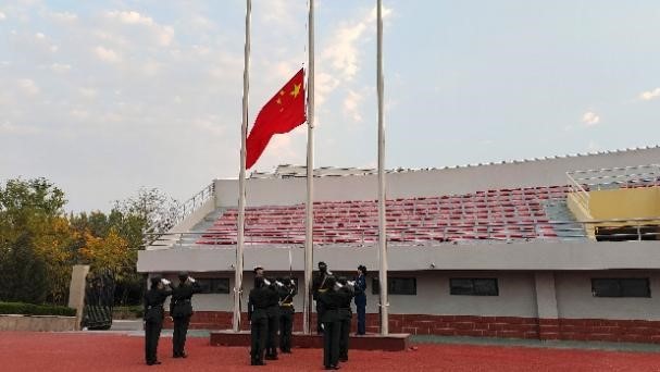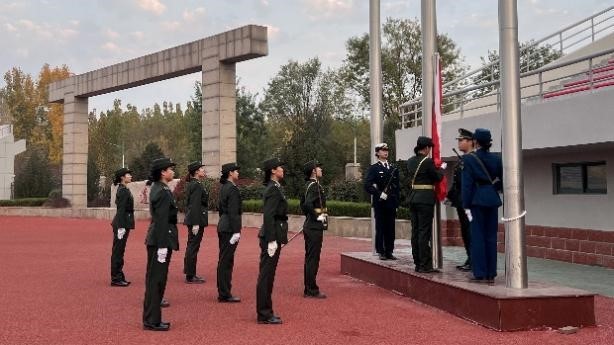 万里河山披锦绣,满眼尽是中国红。在庄严肃穆的氛围中,国旗护卫队迈着铿锵有力的步伐,将五星红旗护送至升旗台。晨曦的阳光洒在大地,全体师生庄严肃立,怀着对国旗对祖国崇高的敬意,一起注视着迎风飘扬的那一抹中国红。