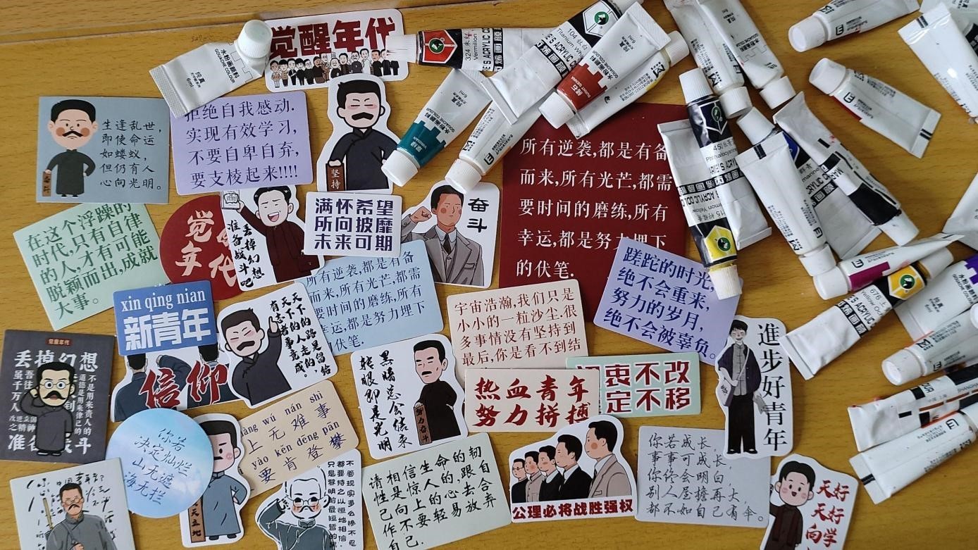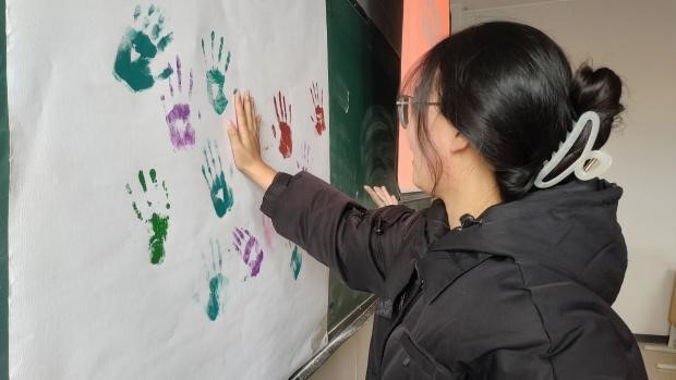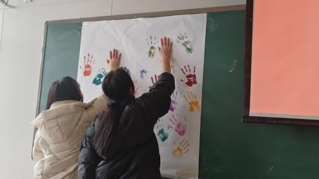 活动中,主持人向同学们介绍了中国共产主义青年团从成立到发展壮大的历史进程,并邀请同学们用手蘸取颜料,印在画布上。同学们热情高昂,随之画布上出现了大大小小的手印。过后,主持人为同学们讲解了中国共产主义青年团相关的历史知识,邀请同学们拿笔在自己的手印上写下中国共产主义青年团的知识和小故事,同学们积极参与,共同完成一幅美丽的团学知识画作。