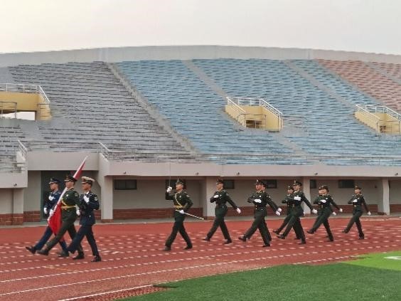 国旗仪仗队迈着整齐划一、铿锵有力的步伐,护送着五星红旗正步走向旗杆。全体师生面向国旗肃立致礼。迎着清晨的第一缕阳光,在雄壮的国歌声中,师生们注视着五星红旗冉冉升起,在熠熠晨光中迎风飘扬。