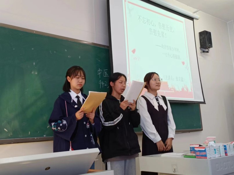 2023级本科药学1班的唐伟芳、张文鑫、李海钰三位同学在“课前十分钟”展示活动中进行了以“不忘初心·告慰历史”为主题的演讲,他们用富有感染力的语言,讲述了对于爱国主义和民族精神的理解和认识,不仅树立了良好的精神风貌,同时也激发了在场同学们的爱国热情和民族责任感。