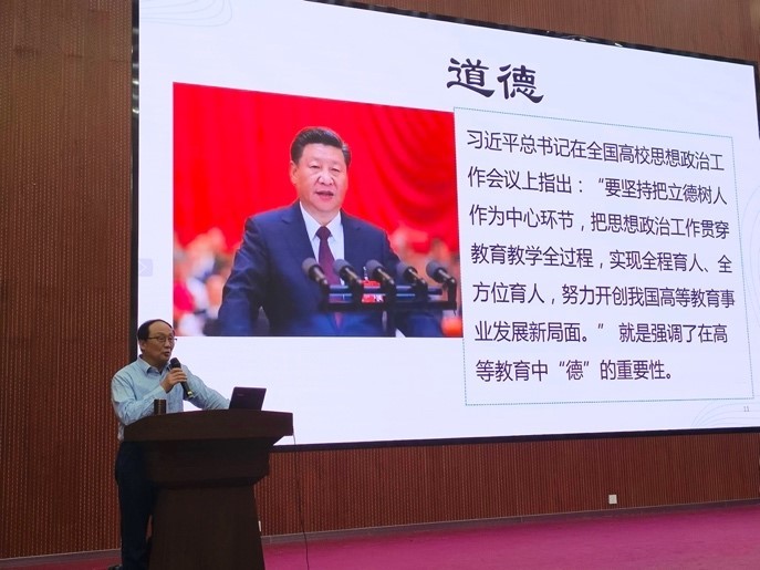 讲座中,李峰院长主要围绕教学四要素“德”“爱”“技”“学”展开。他强调,全体教师要深刻把握新时代“四有”好老师的内涵,自觉加强师德修养,潜心教书育人,文明从教、廉洁从教、规范从教。要牢固树立“教学工作是第一要务”的意识,要以饱满的热情,高昂的斗志,展示良好的师德、修养和精湛的业务能力。要以教育家为榜样,牢记为党育人、为国育才的初心使命,为强国建设、民族复兴伟业作出新的更大贡献。随后,李峰院长就新时代背景条件下教师职业道德建设与职业基本规范进行了多方位的解读,并通过多年高校教学的案例生动诠释了师德师风建设和教育教学方法改革的重大意义。