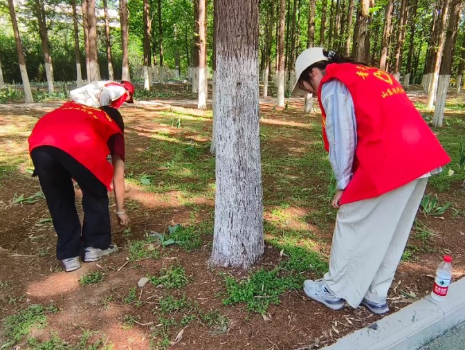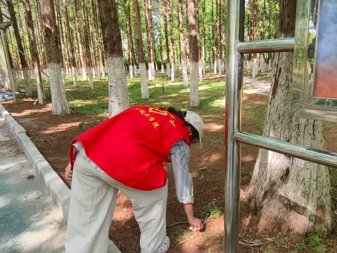 片刻休整过后,同学们穿上红马甲,化身“环境治理官”,以小组为单位进行公园清洁活动,捡拾公园绿化带、道路两侧的垃圾。现代学子充分发扬不怕脏,不怕累的志愿服务精神,相互配合,在一弯一拾中,带走了垃圾,还原了公园美貌,恢复了自然。