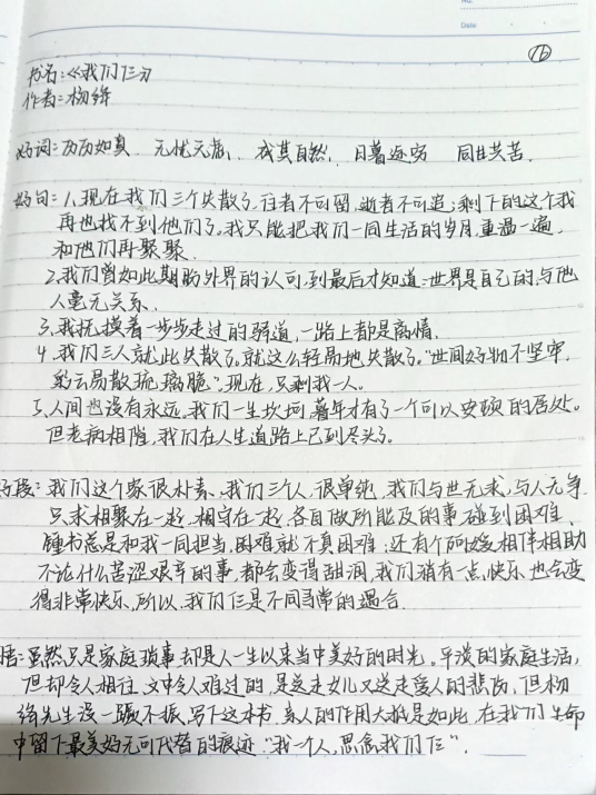何林睿同学对杨绛先生的《我们仨》十分喜爱,这本书是杨绛先生92岁时在失去女儿和丈夫后所著。字里行间流露出的哀而不伤、深厚而诚挚的感情,让人十分触动。何同学钦佩于他们三人一生历经苦难颠沛流离,在那般困境中依然保有稚气和趣味,历经磨难仍然明晰想要的只是相依相伴。希望同学们在来得及的时候珍惜身边人,才能无憾此生。
