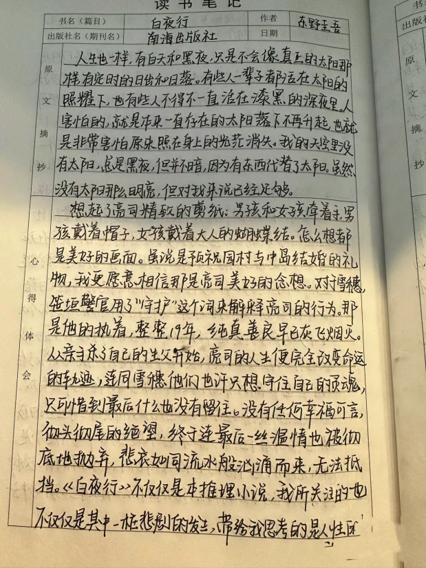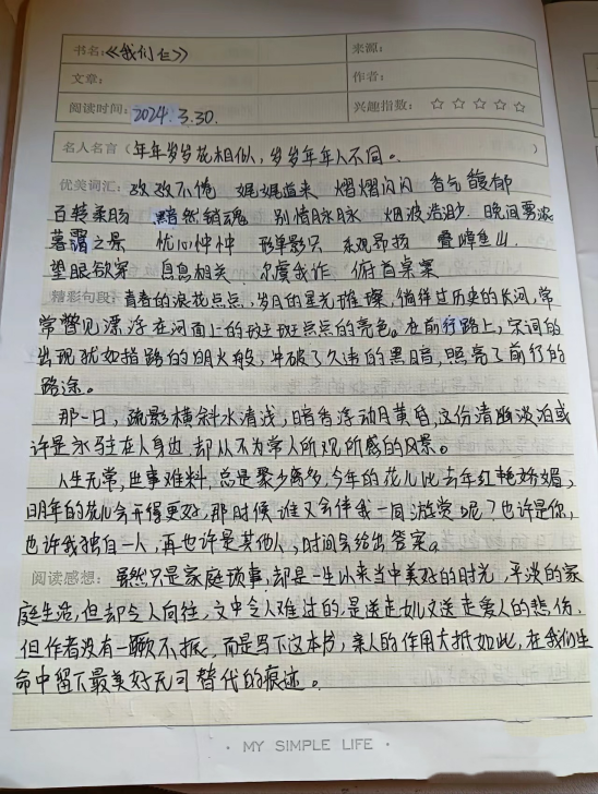 在睡前阅读后,同学们还会写下读书笔记、读书感悟,在班上与其他同学分享书籍,号召同学们积极阅读。