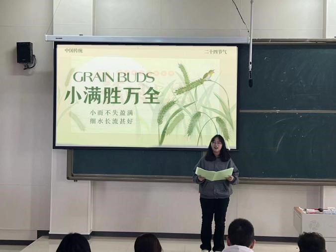 武思岐同学在“课前十分钟”展示活动中,带来了一则以“二十四节气——小满”为主题的演讲。她从文化传承的角度,介绍了小满节气在古诗词、民间故事中的体现,以及它在当代社会中的价值和意义。通过她的演讲,大家更加深入地了解了小满节气的历史渊源和文化内涵,感受到了中华传统文化的博大精深。