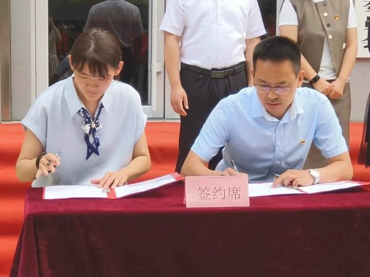 药学院学管就业副院长吕长东和圣井街道党建办副主任王慧共同签订《山东现代学院药学院团支部与圣井街道新城社区结对共建协议书》。