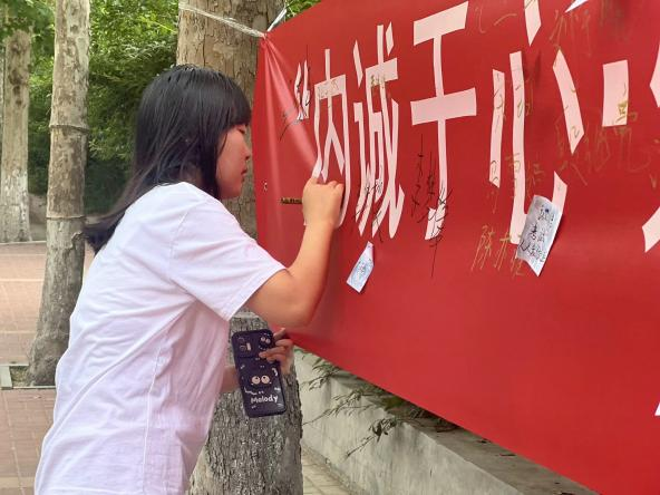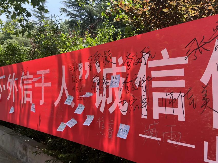 活动现场,横幅高悬,标语醒目,彰显着诚信的重要性。同学们手持马克笔,庄重地在横幅上签下自己的名字,以此立下自己对诚信的坚定承诺。