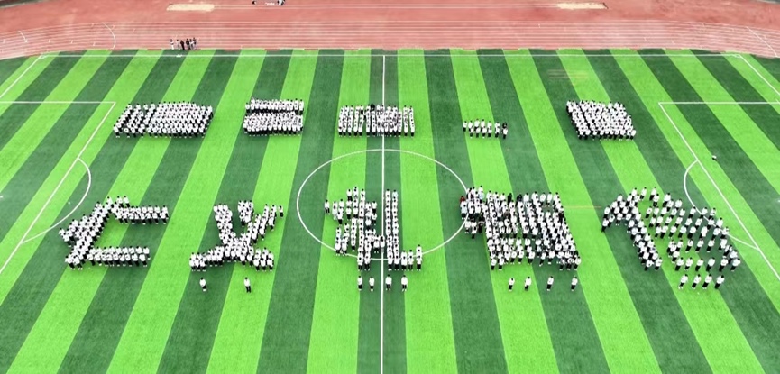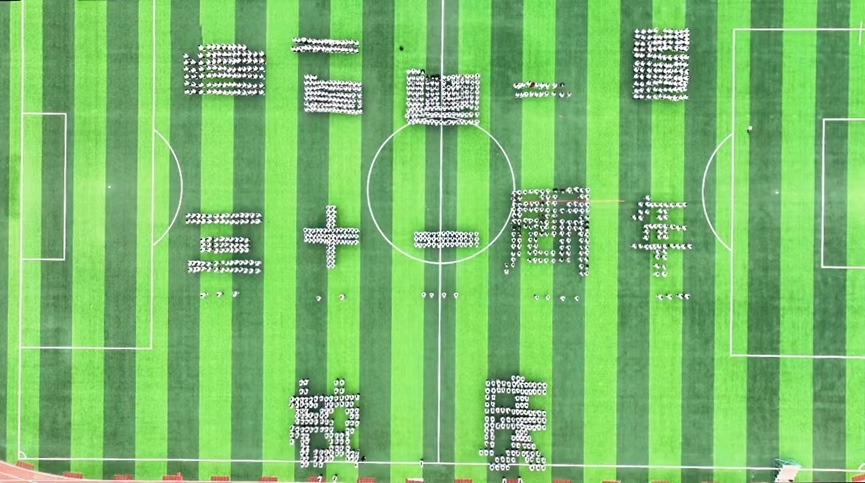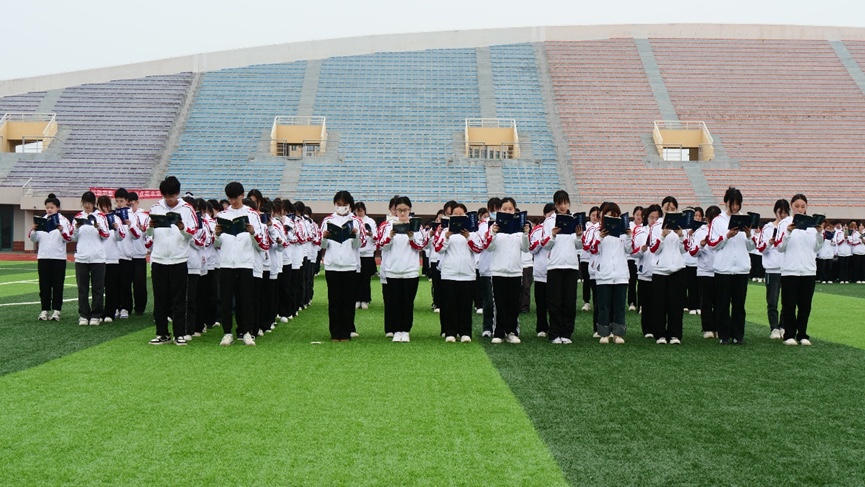 千人齐诵环节,全体学生迅速变换队形,齐诵《大学》。千人诵读的壮观场面令人震撼,同学们的声音回荡在天行健体育场,久久不能散去。
