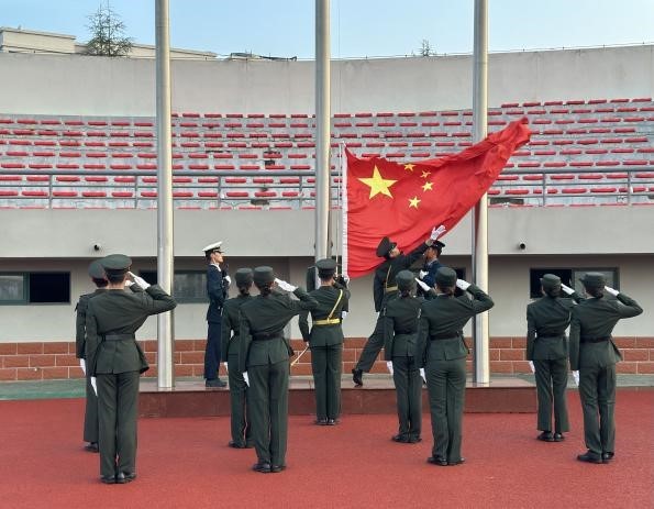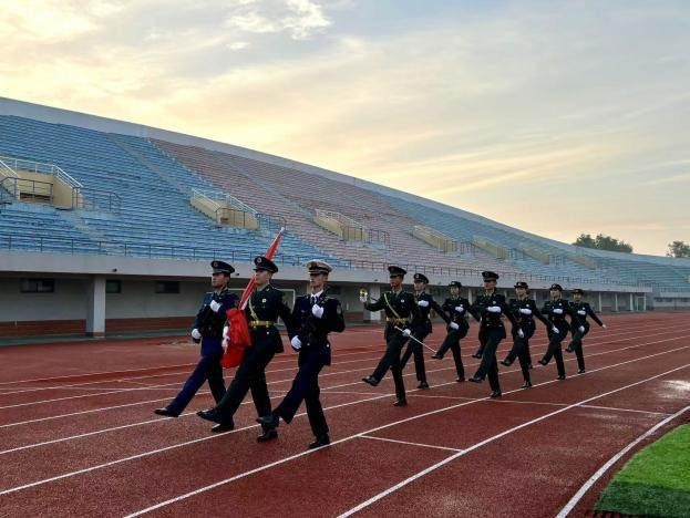 国旗仪仗队迈着整齐划一的步伐,护送五星红旗走向升旗台。