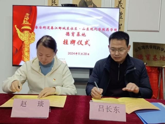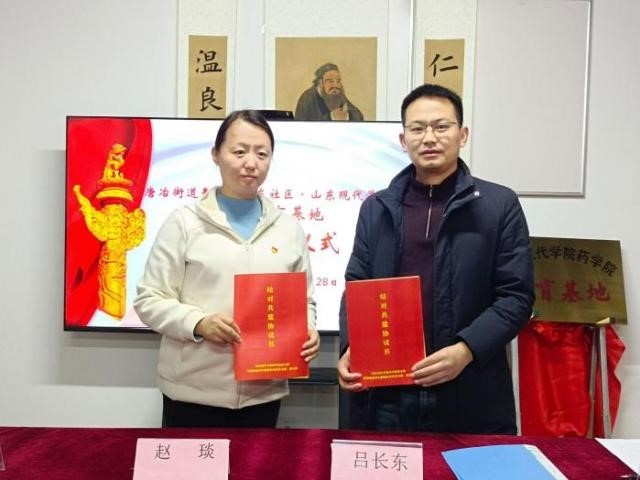 双方共同签订《山东现代学院药学院团支部与春江郦城东社区结对共建协议书》