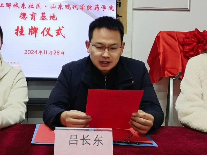 11月28日,药学院与济南市历城区春江郦城东社区举办“洒爱心甘霖·润街坊体魄”揭牌仪式暨志愿服务活动。药学院学管就业副院长吕长东、春江郦城东社区党支部书记赵琰、春江郦城东社区团支部书记刘乘凤出席活动。