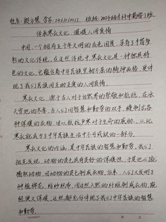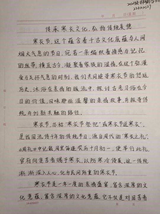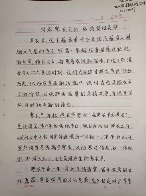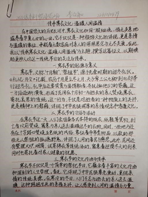同学们踊跃投稿,用文字抒发自己对寒衣文化的理解和对亲情的深厚感受。在参赛作品中,李汶航同学用独特的视角和饱含深情的文字,展现了寒衣文化的魅力;秦兴雨同学的征文中讲述了寒衣节时家人围坐一起的温馨画面,传递出亲情的温暖与珍贵,深深的体现了寒衣文化的内涵和现代价值;殷芳慧同学则通过对寒衣文化历史渊源的追溯,表达了对传统文化的敬仰与传承之志。
