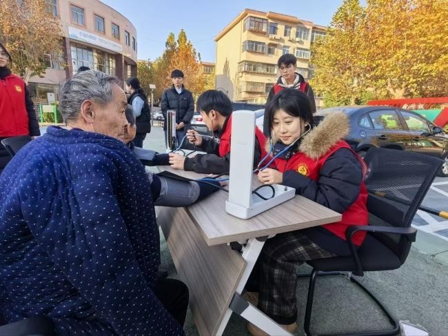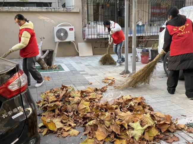 挂牌仪式后,志愿者们迅速投入服务,有序分组行动。 一组志愿者携带清扫工具,细致清理院落及花园中的落叶与杂物,不遗漏任何卫生死角,努力为社区营造整洁舒适的生活环境; 另一组志愿者则使用血压仪为社区居民测量血压,认真记录数据并耐心讲解健康注意事项,将专业、贴心的健康服务送到居民身边。